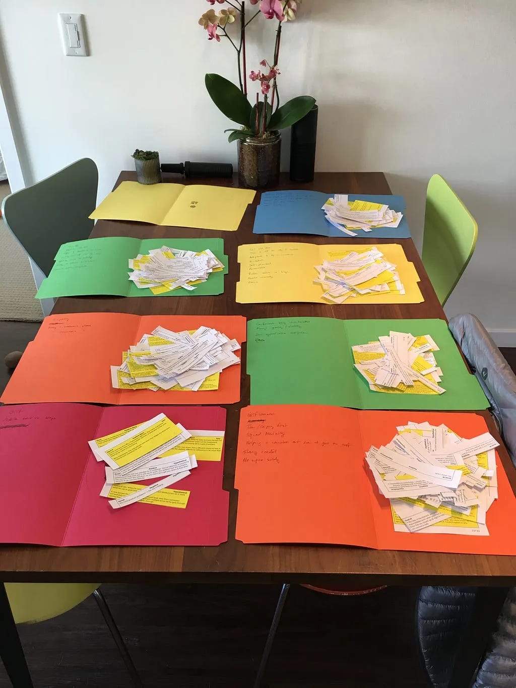 I collected ~500 stories from these answers, and grouped them into themes which formed the basis of our cultural pillars (we discovered we have 7 of them). It’s important to note that my teammates did most of the work here: by generating the stories. Grouping them just involved finding similarities among the stories, both negative & positive. My dining room table looked like this for about a month.