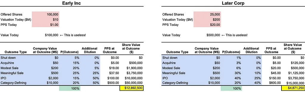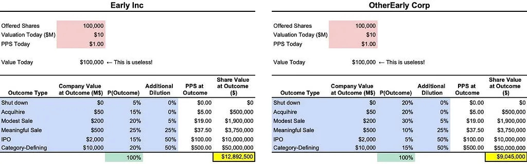 The probability of worse outcomes for Later Corp is also lower, given that the mortality rate of startups tends to decrease as they raise more money. Nevertheless, since we have a more optimistic view for Early Inc over the long run, the optimism-weighted average reveals that Early Inc shares are worth more than 3x those of Later Corp.