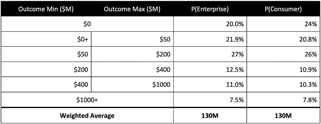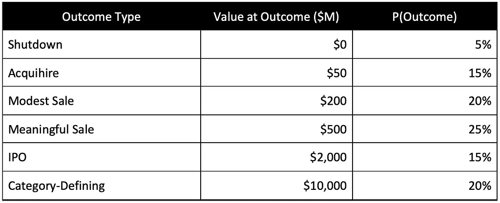 That said, if you’re relying exclusively on the base rates above, you’re essentially telling yourself that Early Inc is an “average company,” and that could end up dramatically underestimating the outlier outcomes that you’re so carefully attempting to factor-in. So you should use these base rates as a sanity check rather than a replacement for your own probability projections.